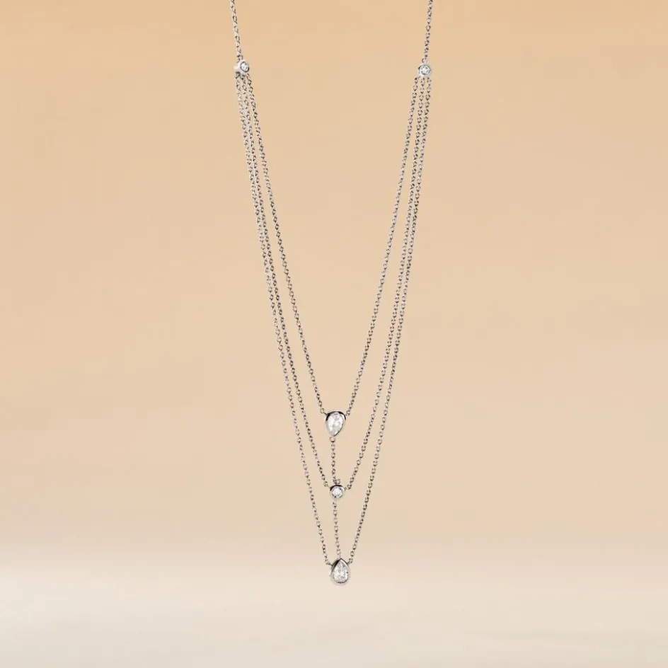 Collier Argent Blanc 925/1000 Triple Chaine Goutte Et Cercle Oxydes De Zirconium Maille Jaseron 38+2cm