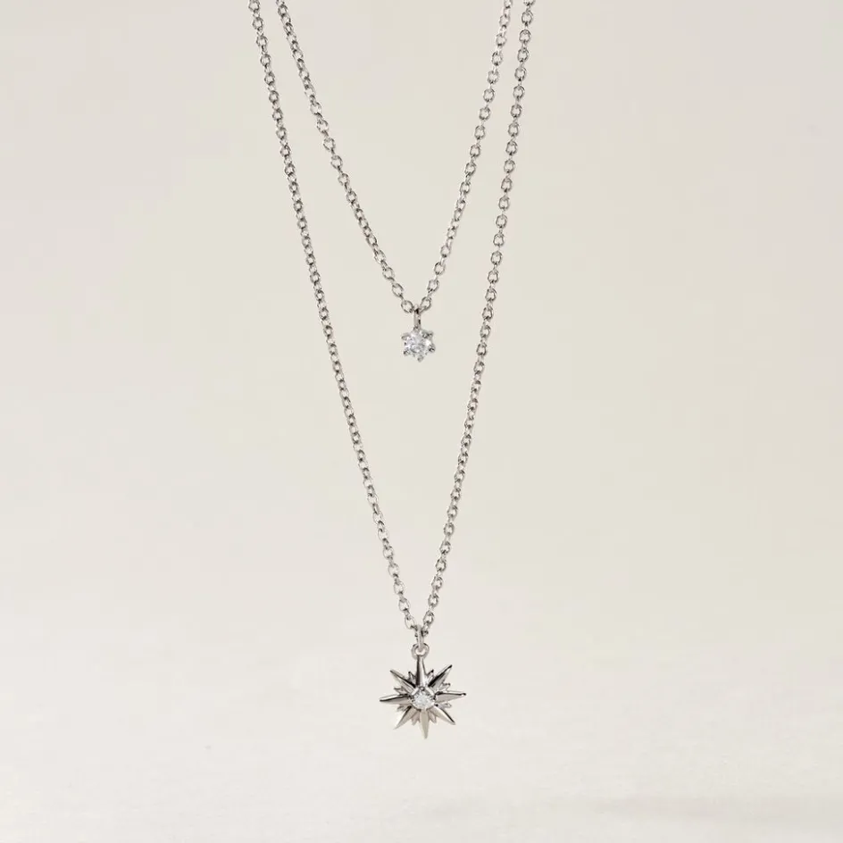 Collier Double Chaines Argent 925/1000 shone Motif Etoile Micro Setting Oxydes De Zirconium Maille Forçat 45cm