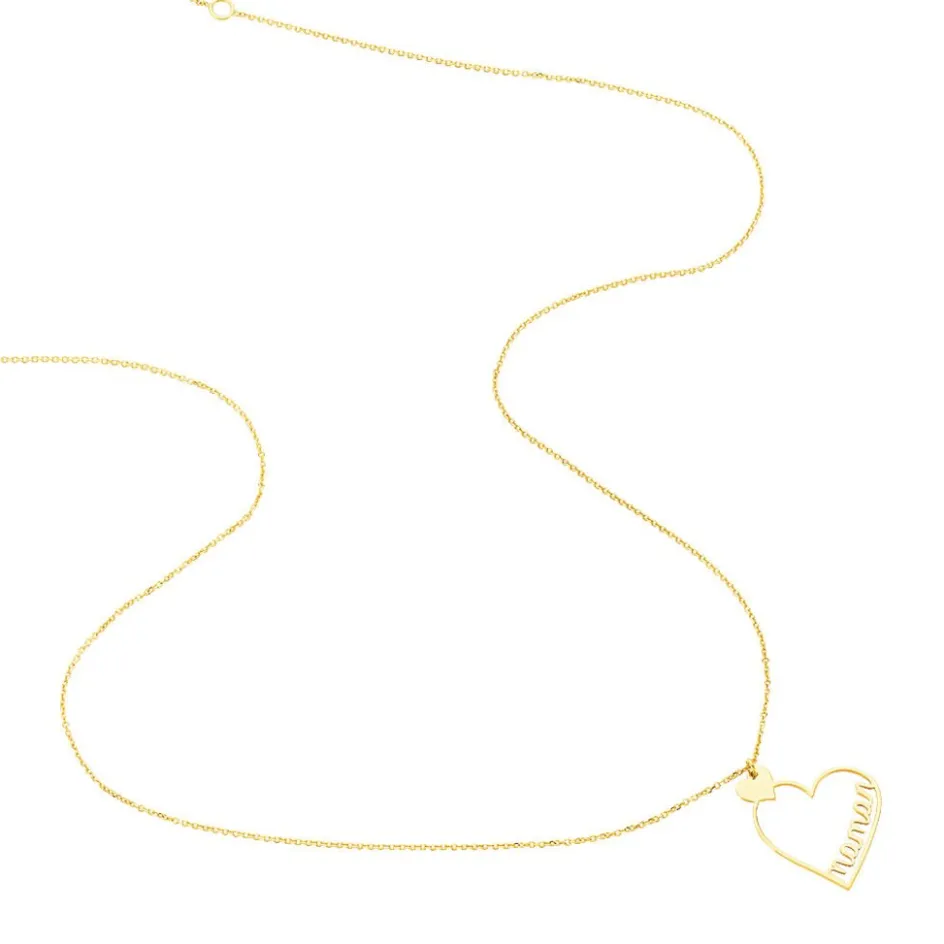 Collier Or Jaune 375/1000 C艙ur Penche Ajoure + Petit C艙ur Plein Message Maman Maille Jaseron 42cm