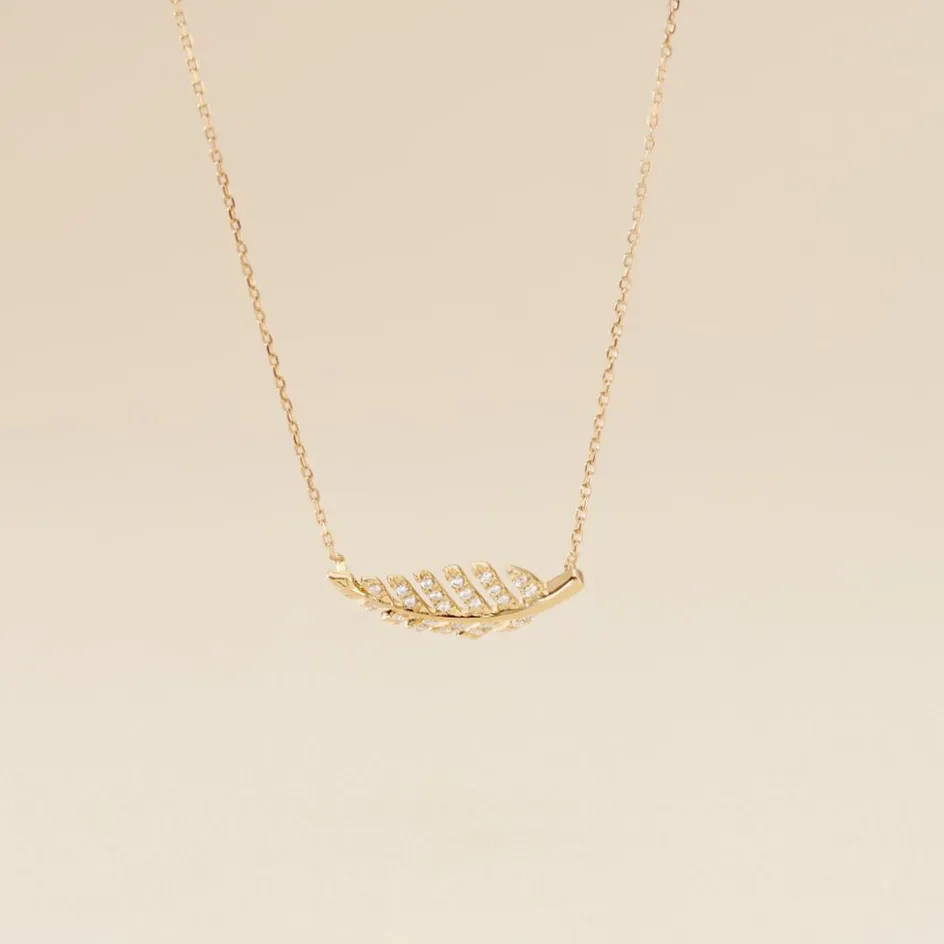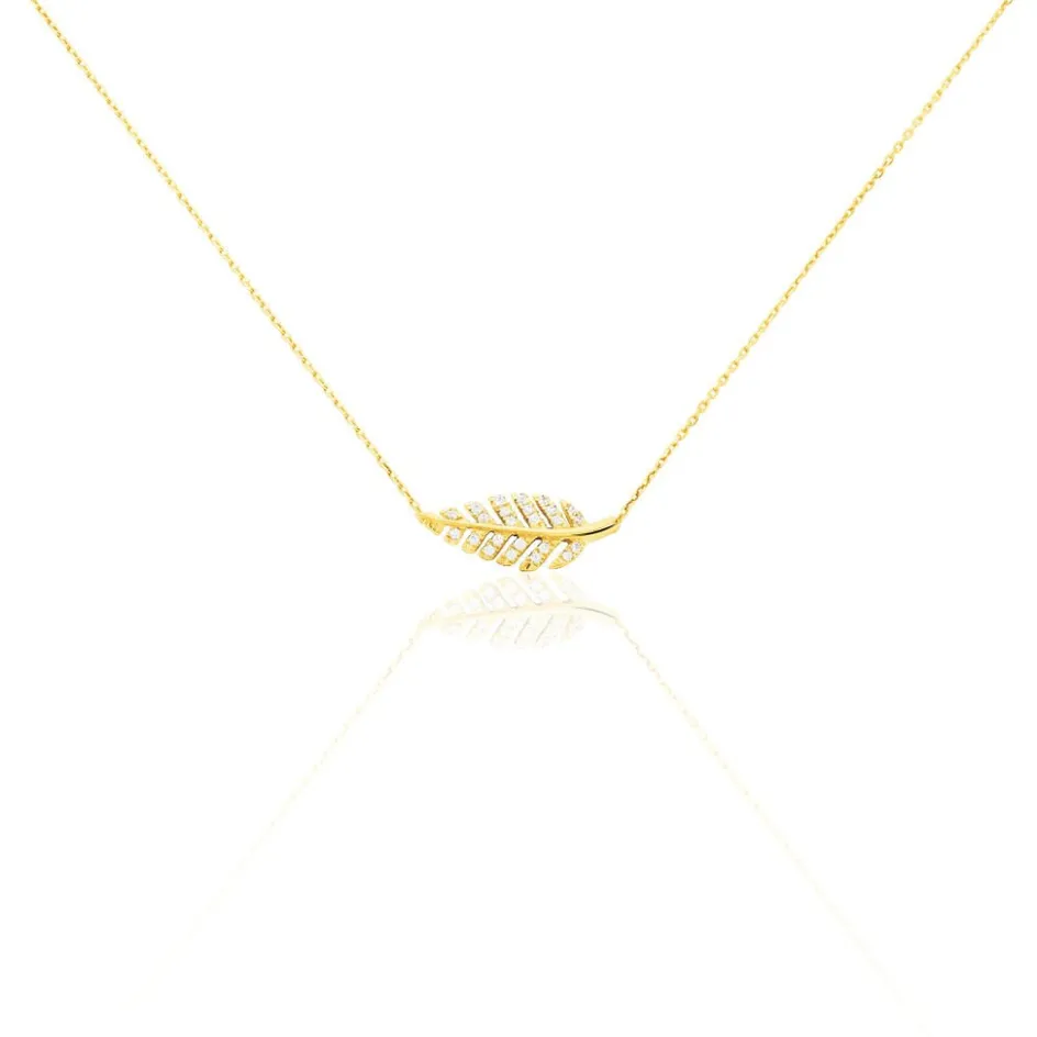 Collier Or Jaune 375/1000 Motif Feuille Ajoure + Pavage Oxydes De Zirconium 42cm