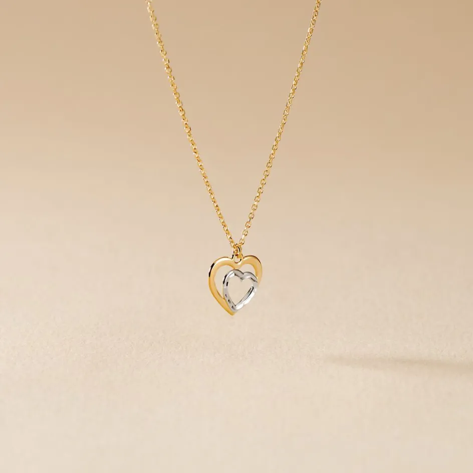 Collier Or Jaune 375/1000 Double C艙urs Ajoures Avec Un C艙ur Effet Diamante Argente Maille Jaseron 40+2cm