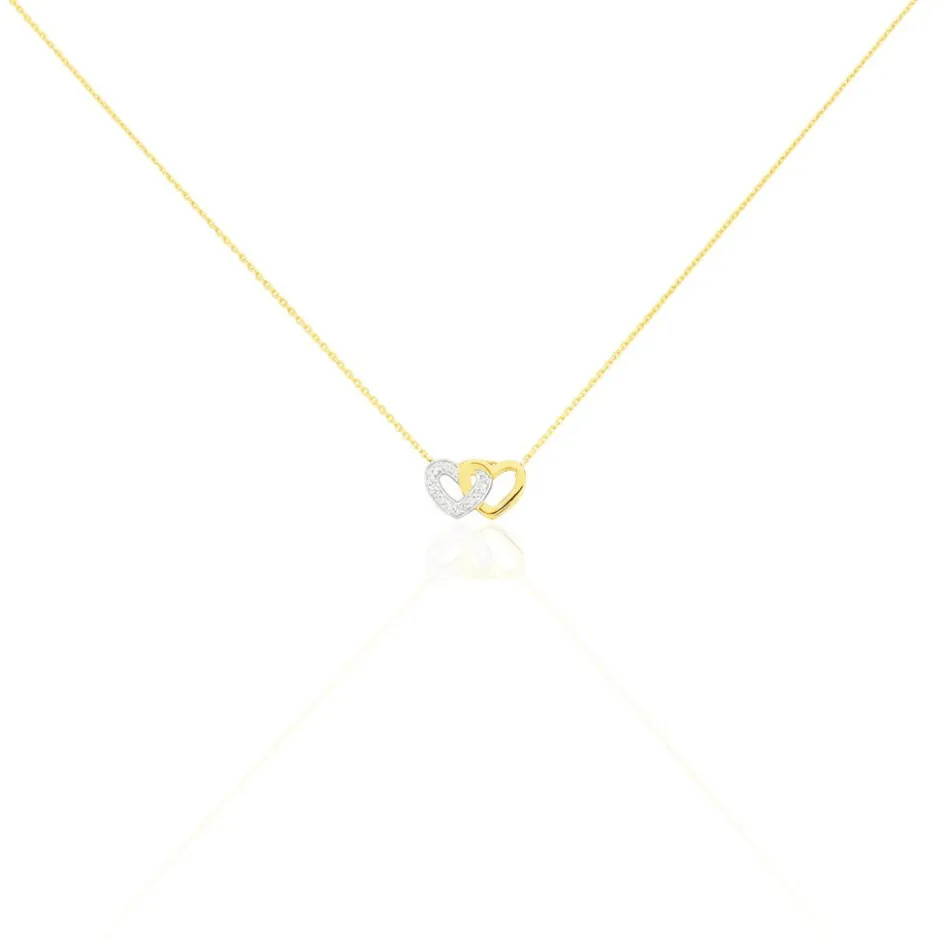 Collier Or Jaune 375/1000 C艙ur Double Pavage Diamants 42cm