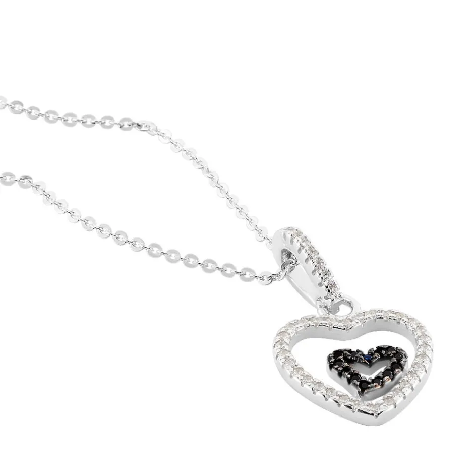 Collier Argent 925/1000 yelin Double Coeur Ajoure Pavage Oxydes De Zirconium Blancs Et Noirs 42cm