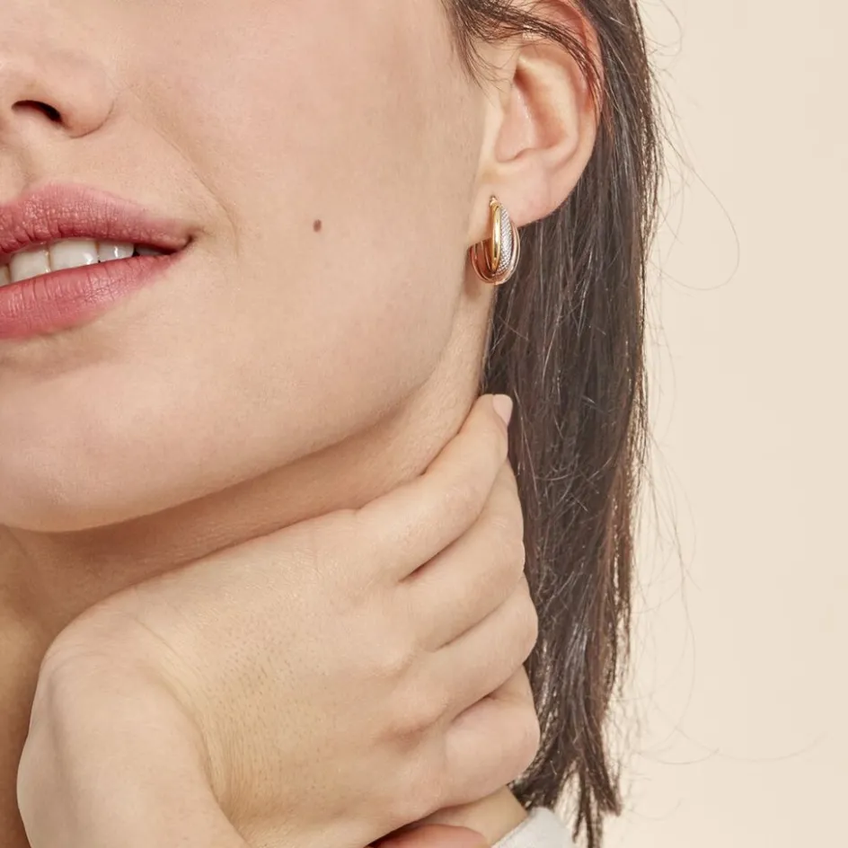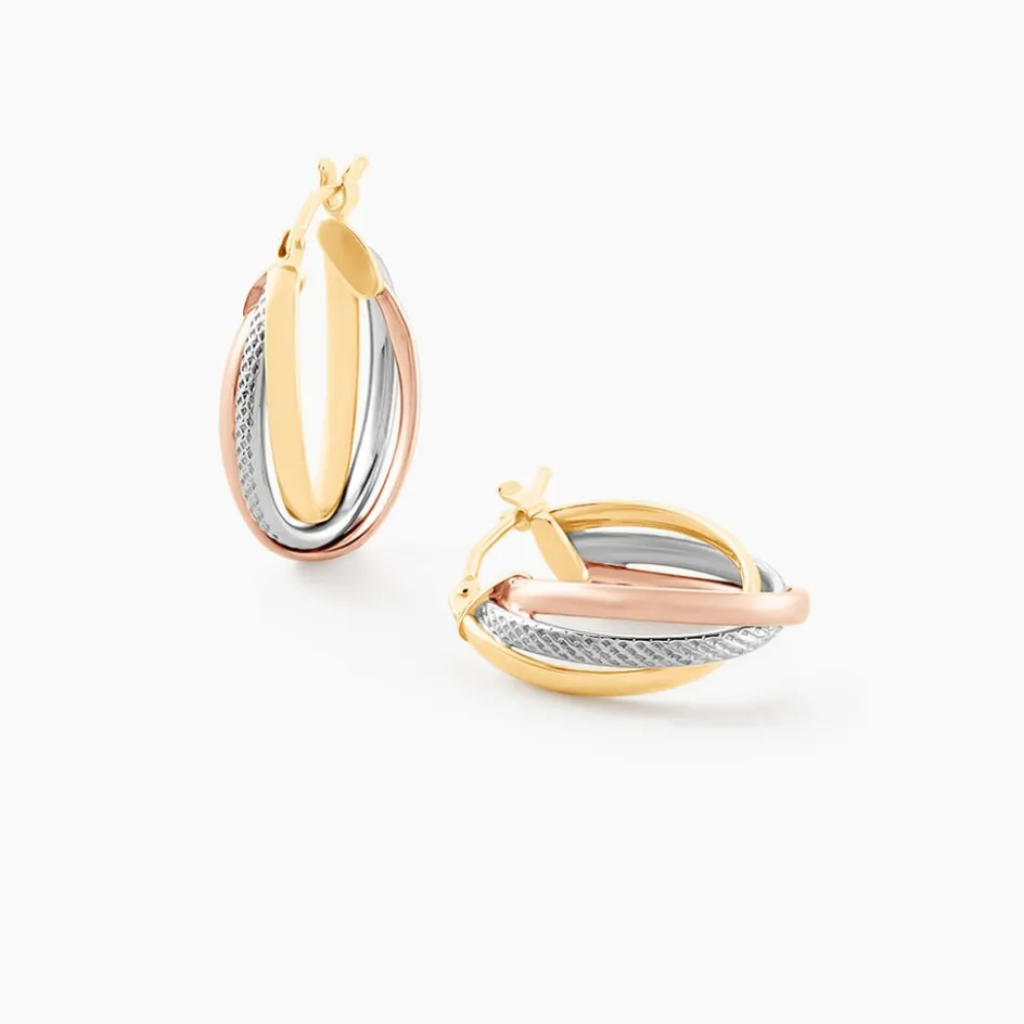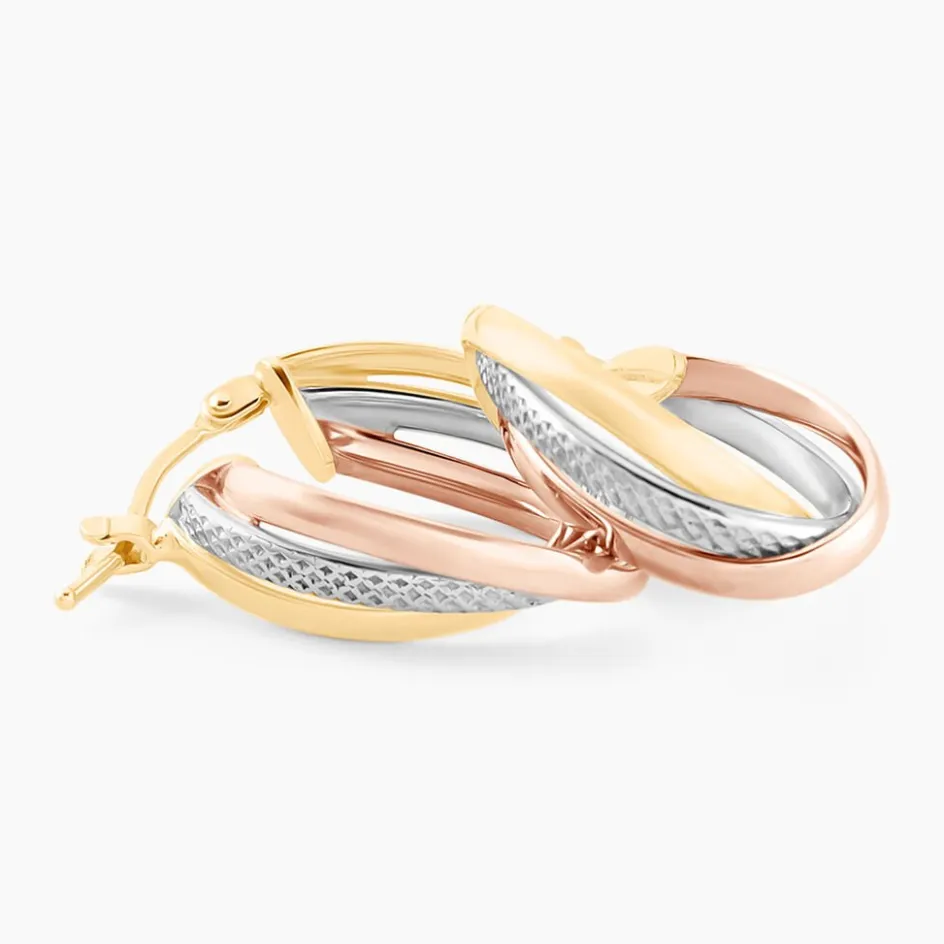 Créoles Or Tricolore 375/1000 Trois Fils Demi Jonc Dont 1 Fil Effet Diamanté Largeur 1.8mm Diamètre 14x10mm