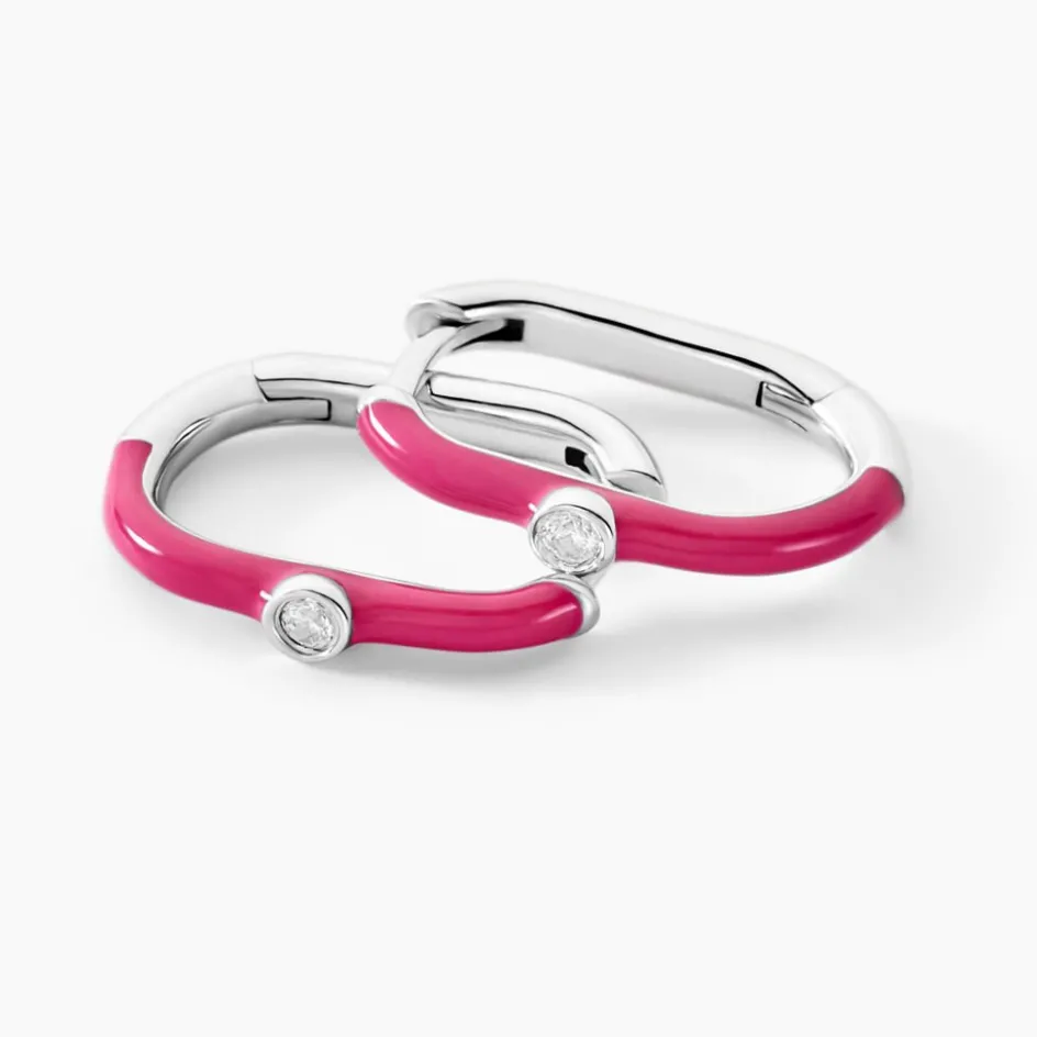 Créoles Argent Blanc 925/1000 Rectangulaires émail Rose Oxydes De Zirconium Serti Clos Diamètre 13*8mm