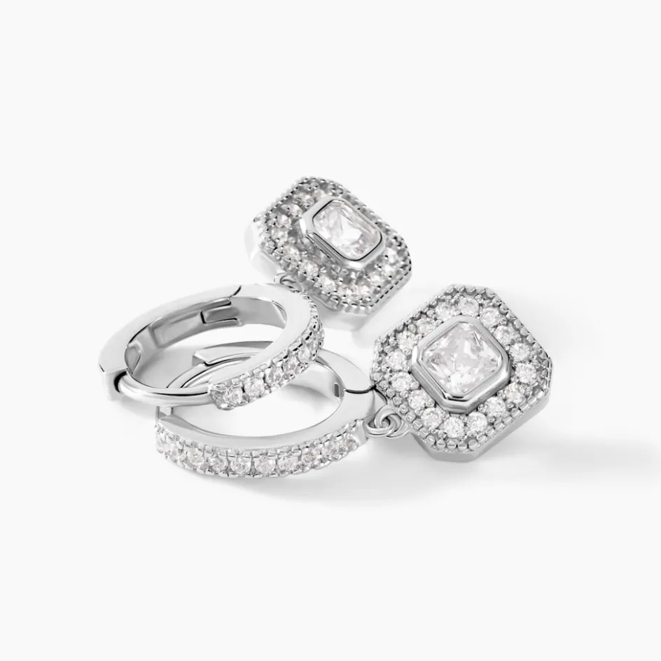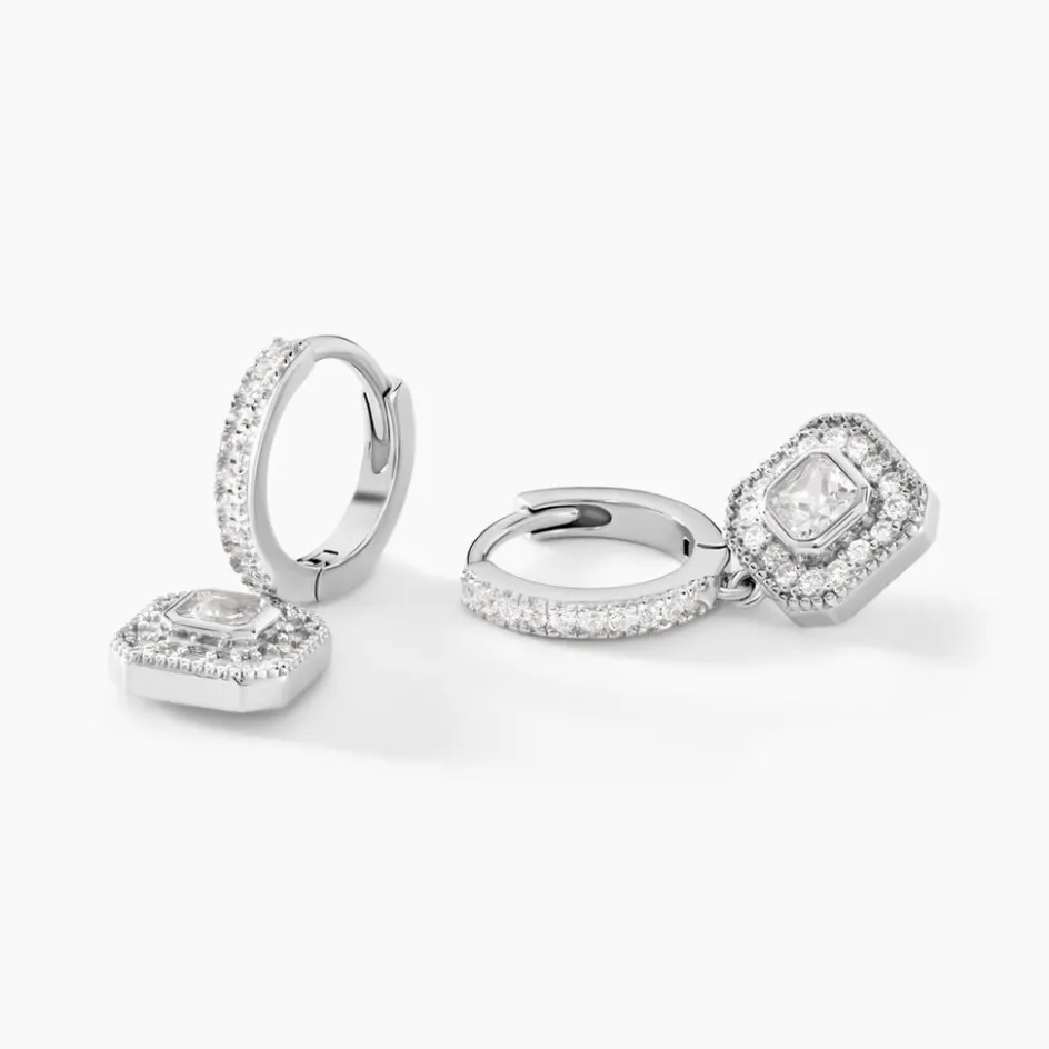 Créoles Argent Blanc 925/1000 Pampilles Carrées Oxydes De Zirconium Et Pavage Diamètre 10mm