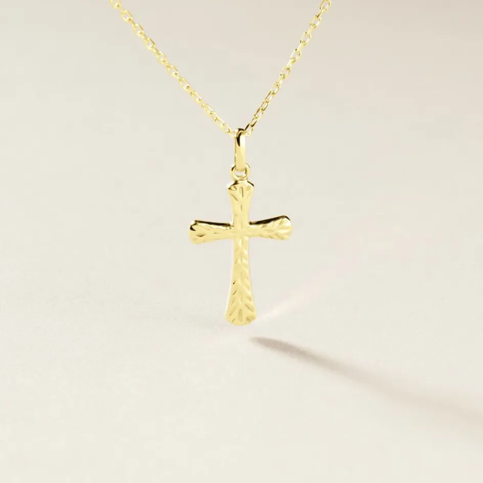 Pendentif Or Jaune 375/1000 Motif Croix Religieuse Striée