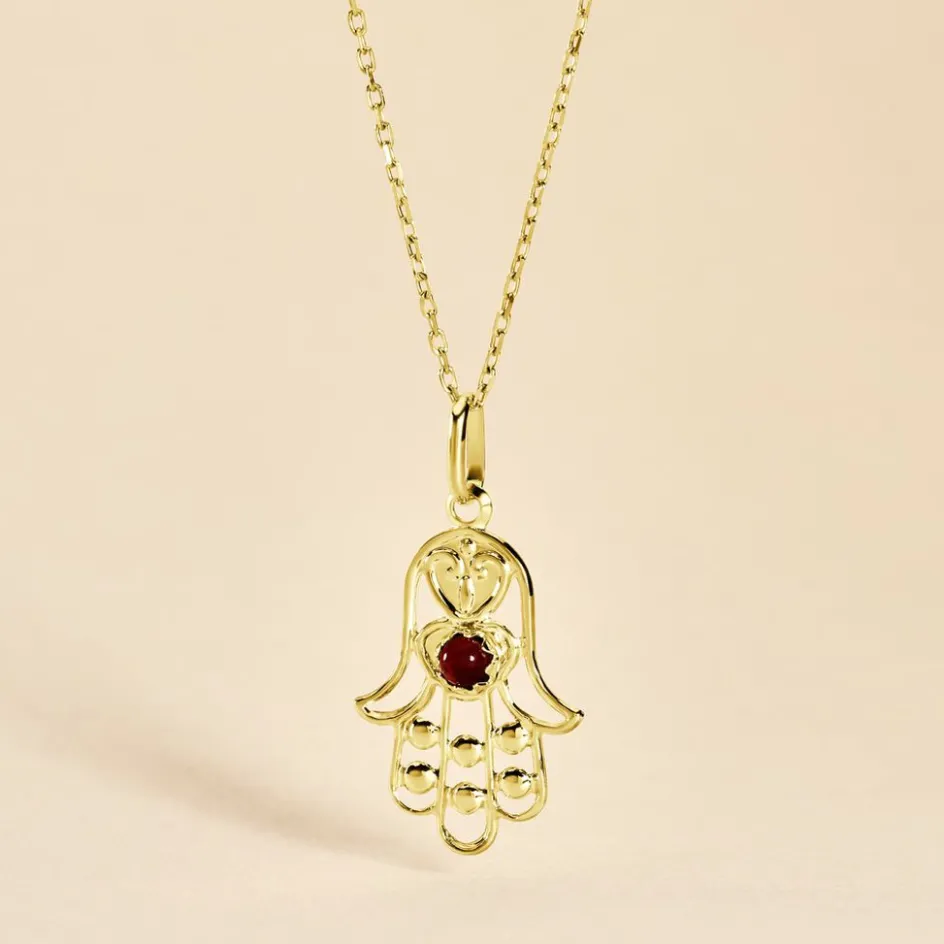 Pendentif Or Jaune 375/1000 Motif Main De Fatma Ajouree Oxyde De Zirconium Rouge