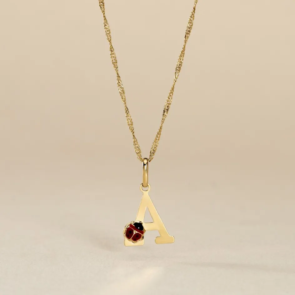 Pendentif Or Jaune 375/1000 Lettre A Motif Coccinelle Email Noir Et Rouge