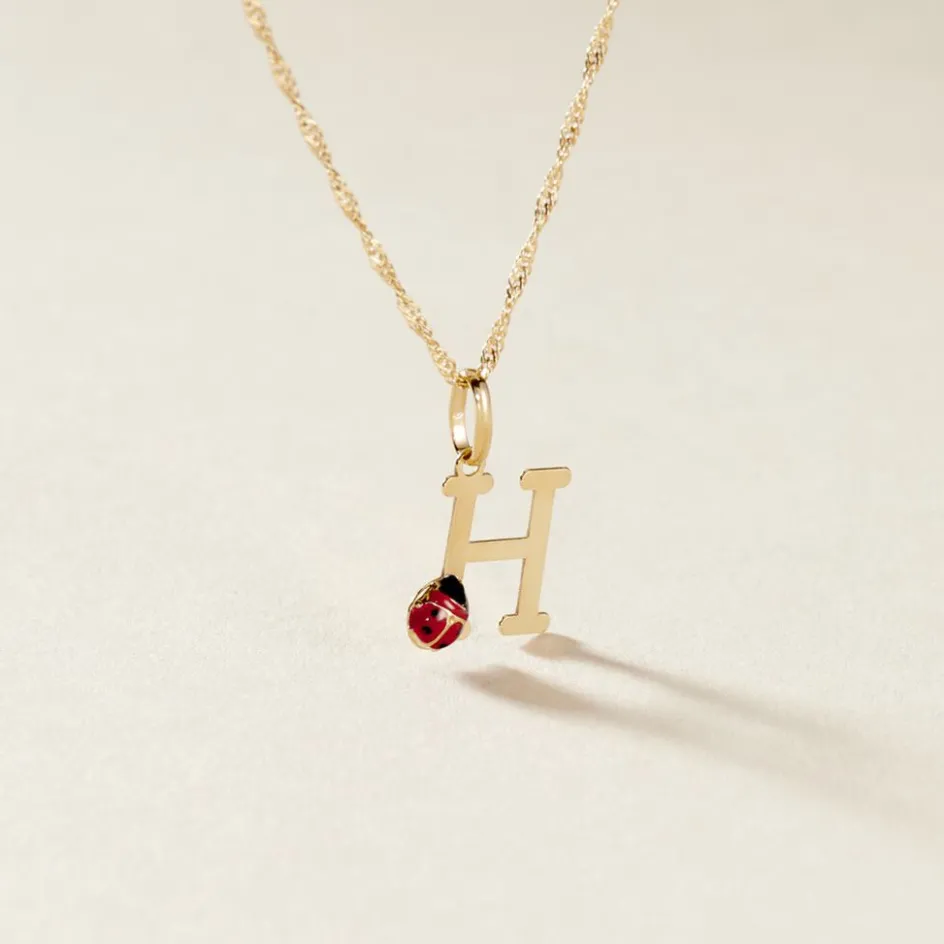 Pendentif Or Jaune 375/1000 Lettre H Motif Coccinelle Email Noir Et Rouge