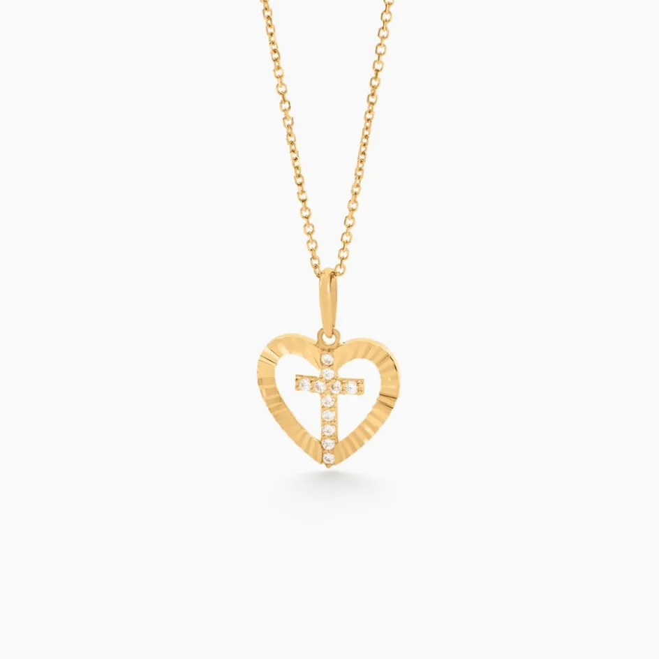 Pendentif Or Jaune 375/1000 C艙ur Ajoure Strie Avec Croix Oxyde De Zirconium