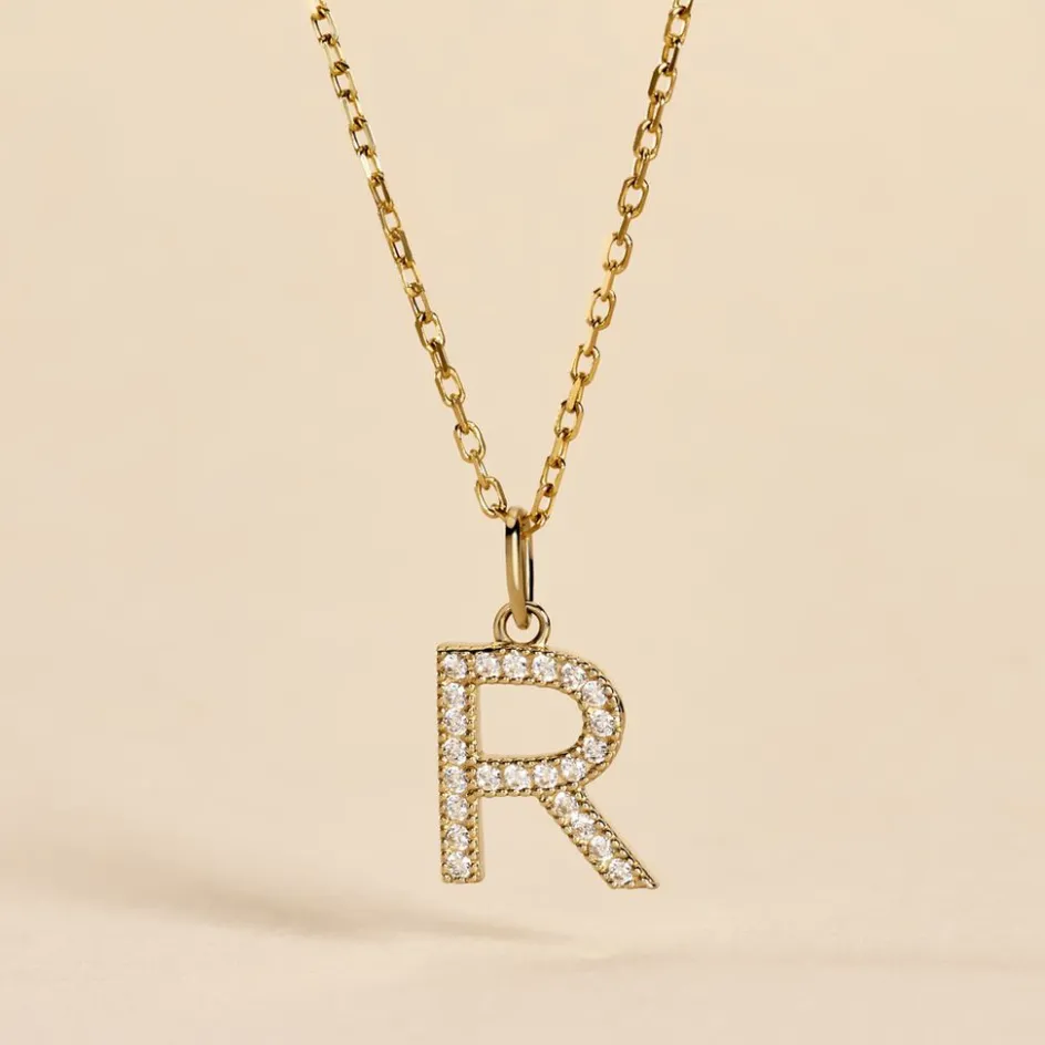 Pendentif Or Jaune 375/1000 Lettre R Oxydes De Zirconium