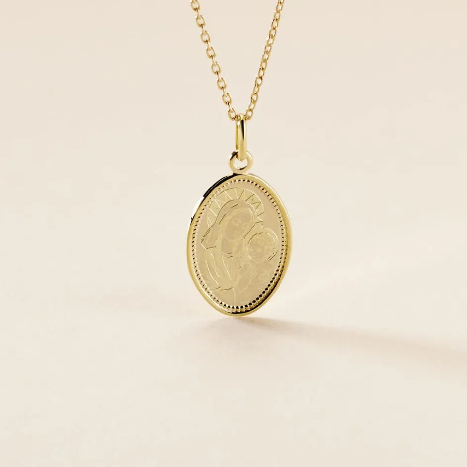 Pendentif Or Jaune 375/1000 Ovale Motif Vierge A L’enfant