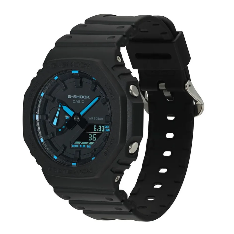 Montre Casio G-shock Résine Noir Ronde Quartz Multifonctions 48.5mm Fond Noir Et Index Bleu Bracelet Résine Noire Ga-2100-1a2er