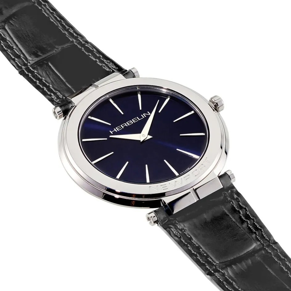 Montre Herbelin Newport Slim Acier Argente Ronde Quartz 40mm Fond Bleu Bracelet Cuir De Vachette Noir 19522ap15