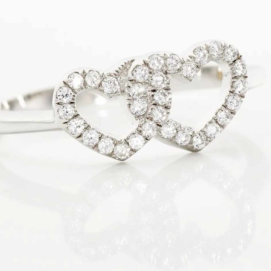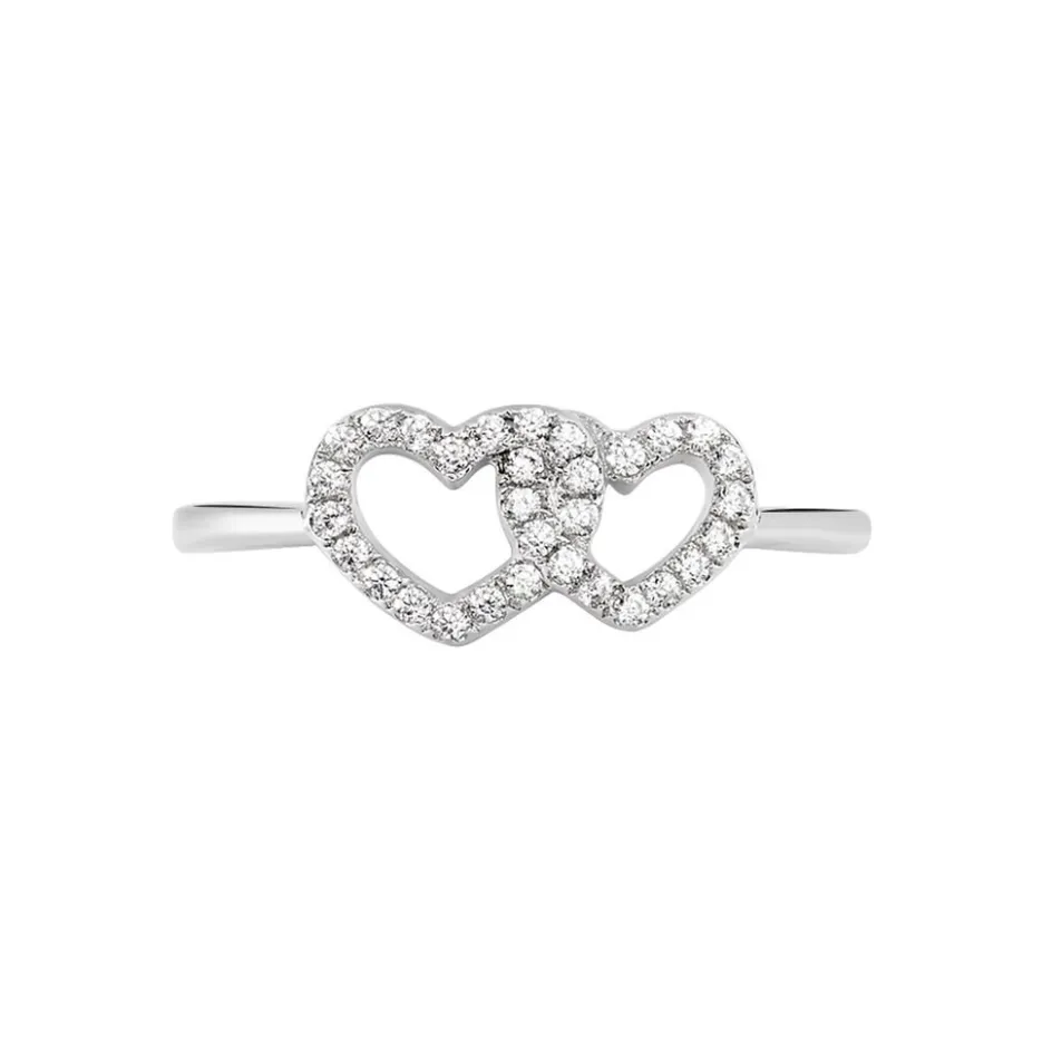 Bague Argent Blanc 925/1000 2 Coeurs Ajoures Entrelaces Pavage Oxydes De Zirconium