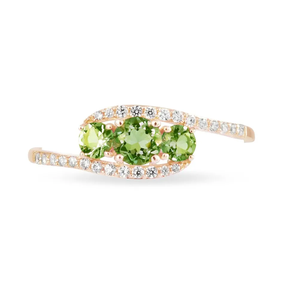 Bague Or Rose 375/1000 Trilogie Péridots Verts 0.64ct Sertis 4 Griffes Et Oxydes De Zirconium