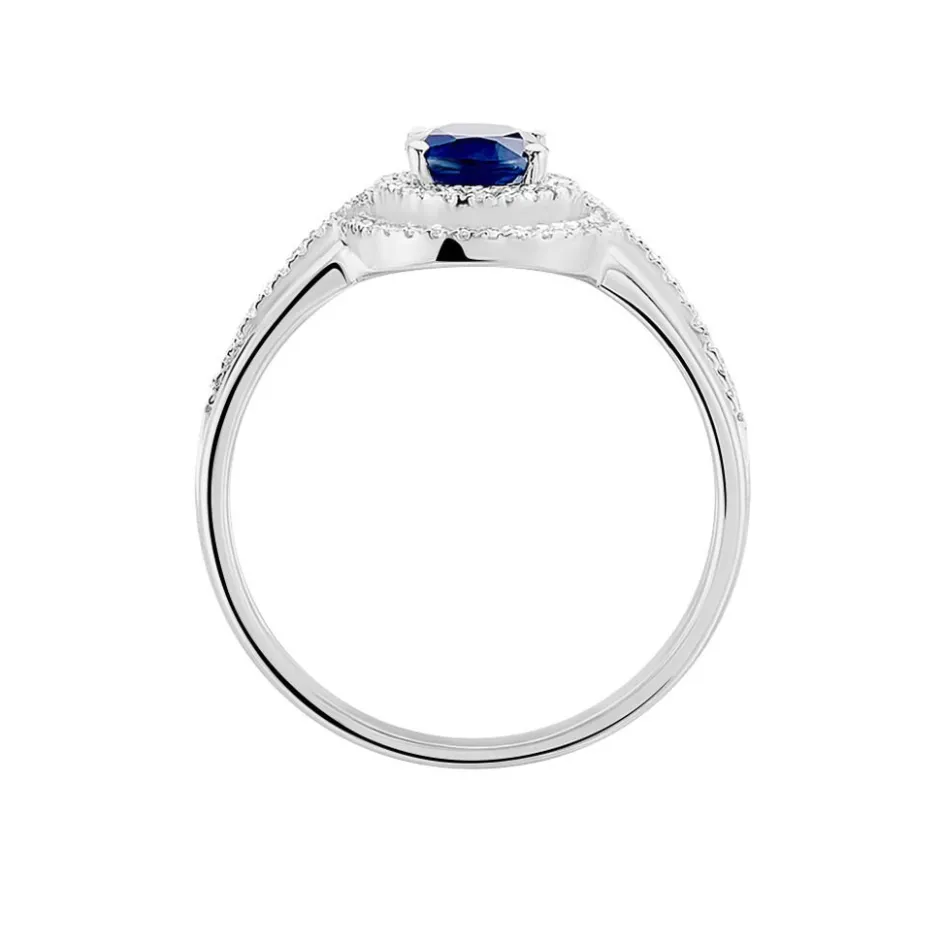 Bague Or Blanc 375/1000 Saphir Serti Griffes Entourage Diamants Corps Triple