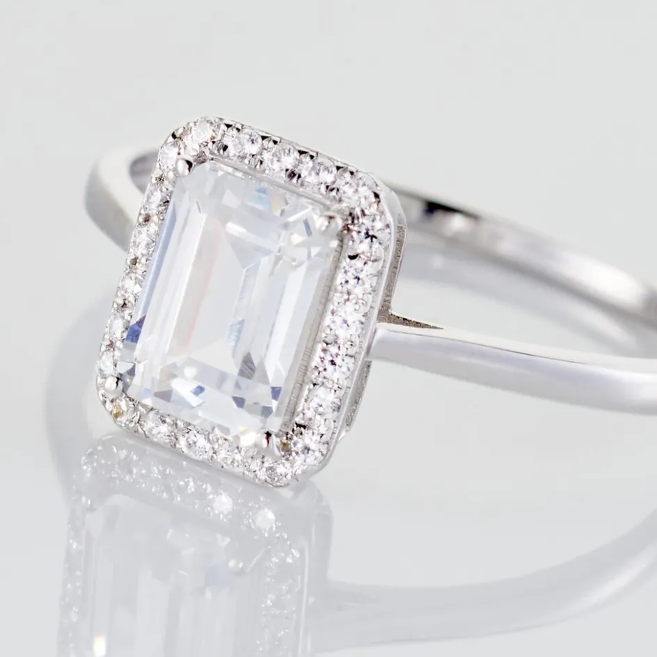 Bague Or Blanc 375/1000 Oxyde De Zirconium Taille Emeraude Entourage Oxydes De Zirconium