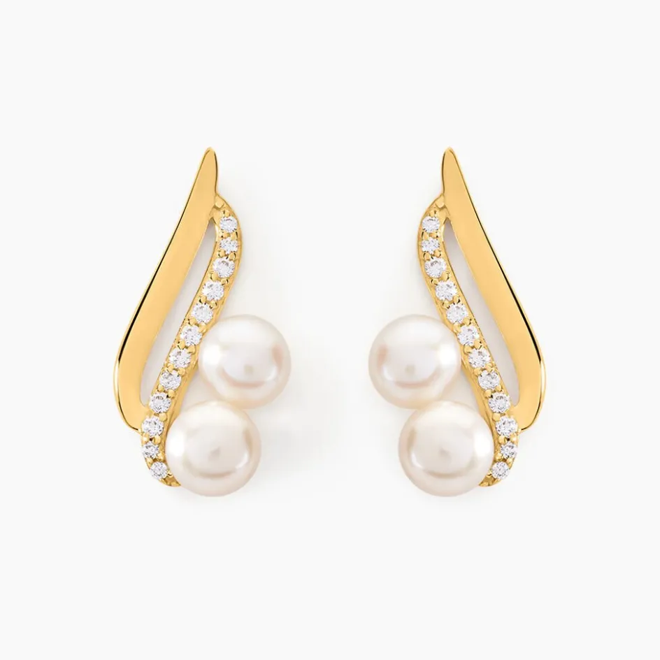 Boucles D’oreilles Or Jaune 375/1000 Formes Vagues Perles De Culture 4mm Et Oxydes De Zirconium
