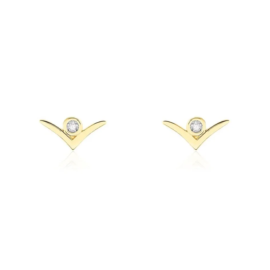 Boucles D’oreilles Puces Or Jaune 375/1000 Motif Aile De Mouette Avec Diamants 0.006cts Serti Pavage