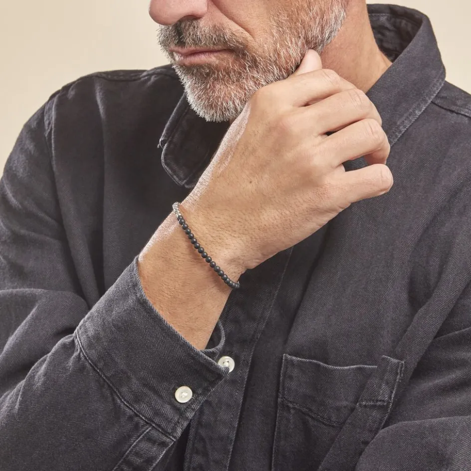 Bracelet Acier Inoxydable Blanc Boules Onyx Noir Maille Jaseron 21cm