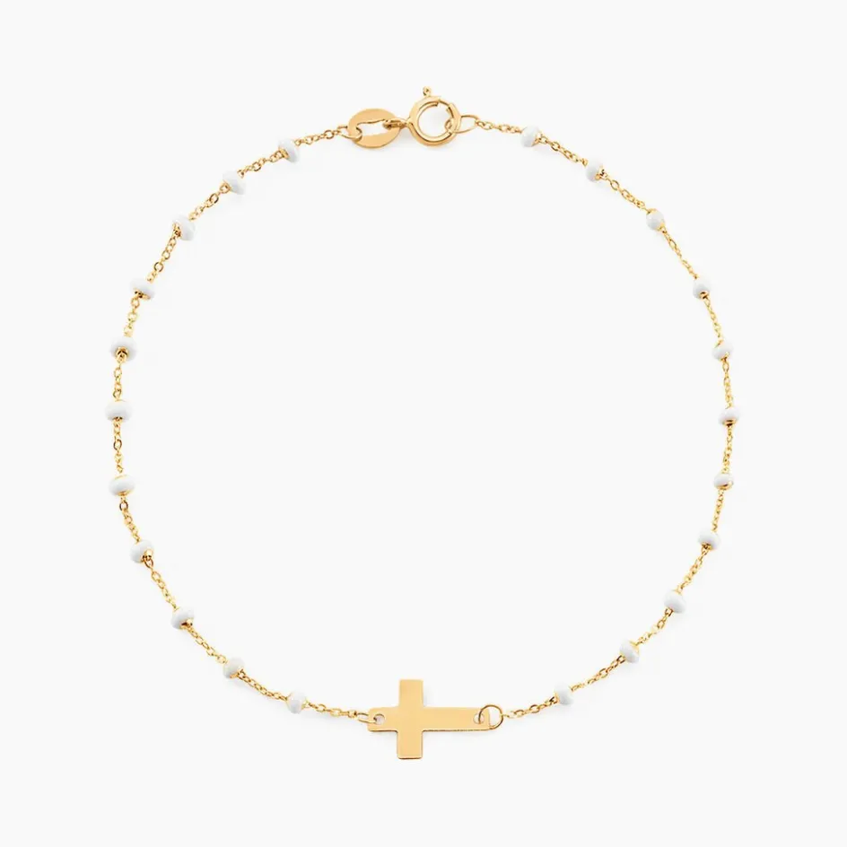 Bracelet Or Jaune 375/1000 Croix Et Email Blanc Boules Maille Fantaisie 16+2cm