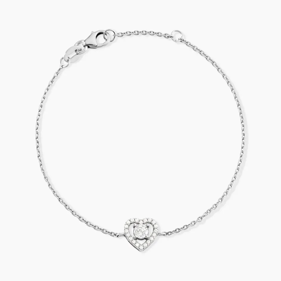 Bracelet Argent Blanc 925/1000 C艙ur Oxyde De Zirconium Et Pavage Maille Forçat 16+2cm