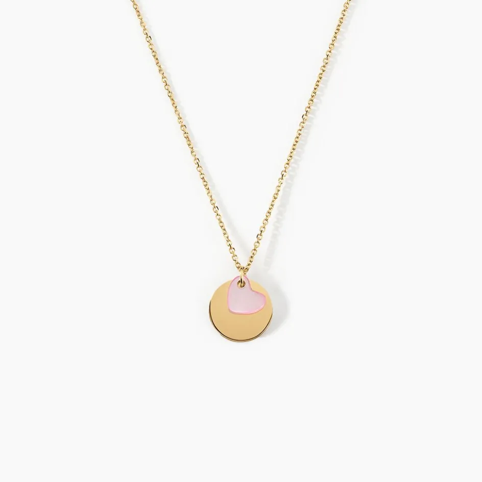 Collier Or Jaune 375/1000 Pastille + Motif C艙ur Pendant Nacre Rose Maille Jaseron 38cm