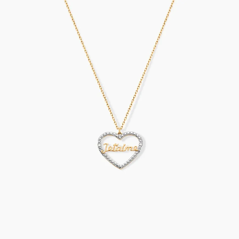 Collier Or Jaune 375/1000 C艙ur Ajoure Message Pavage Diamants Maille Forcat 42+3cm