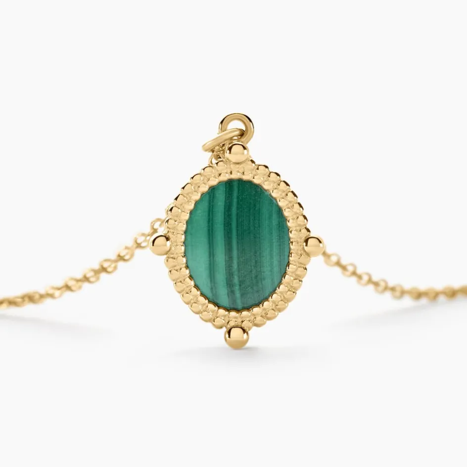 Collier Or Jaune 375/1000 Malachite Ovale Effet Perle Maille Jaseron 40+2cm