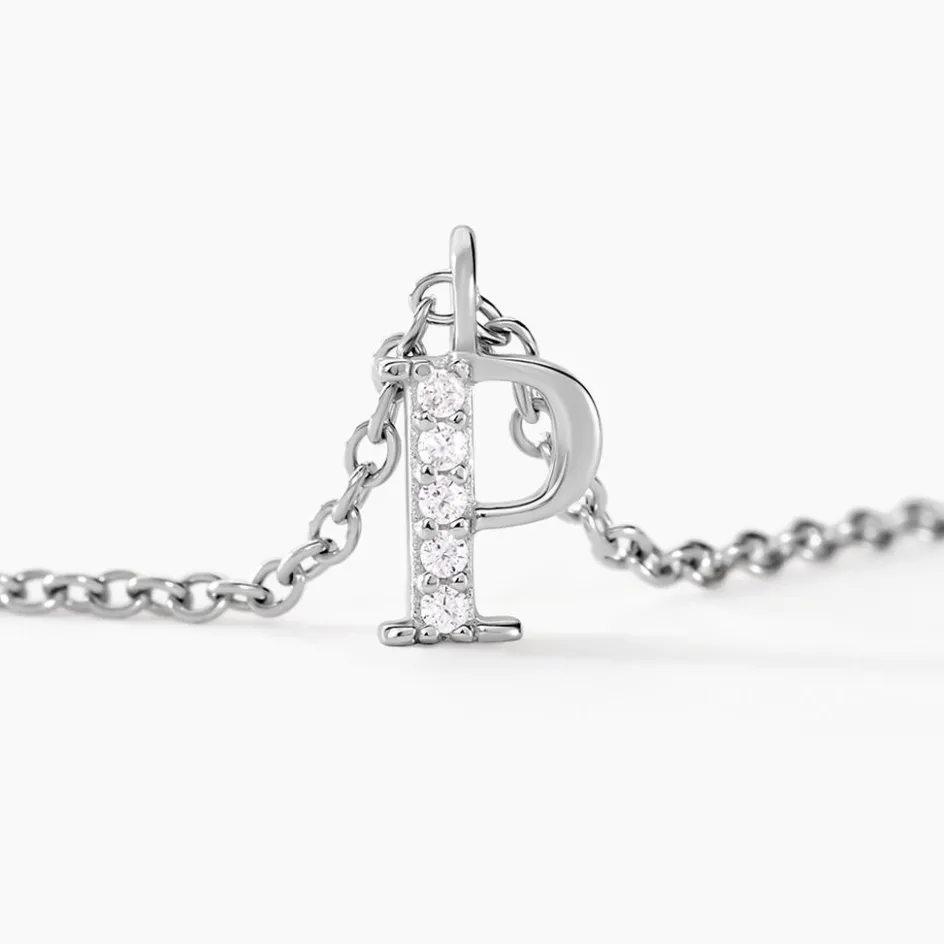 Collier Argent Blanc 925/1000 Lettre P Semi Pavage Oxydes De Zirconium Maille Forçat 38+3cm