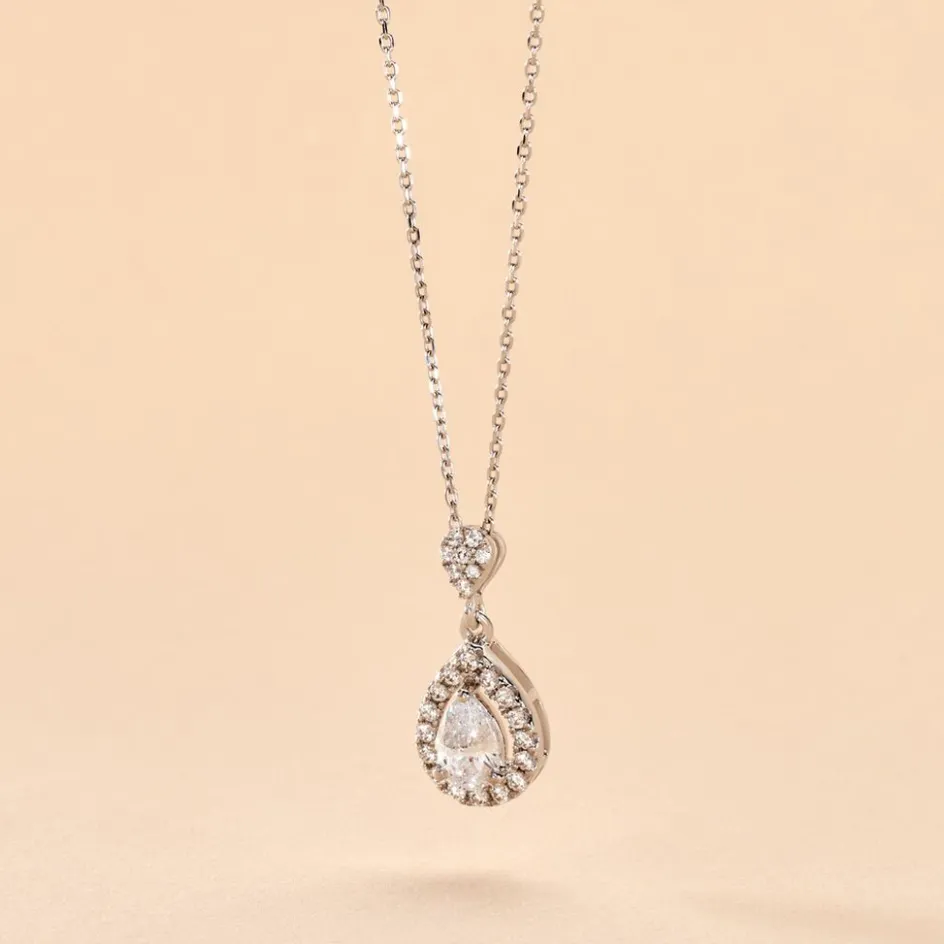 Collier Or Blanc 375/1000 Oxyde De Zirconium Blanc 0.68cts Serti Griffes Forme Poire Entourage Oxydes 40+2cm