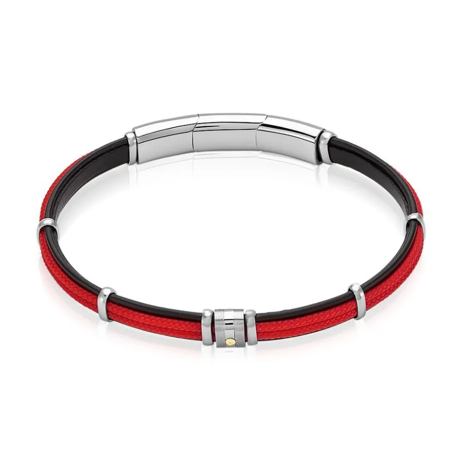 Bracelet Jourdan Homme Cuir Noir Cordelette Rouge Acier Gris Et Decor Or 21.5cm Jh150143b