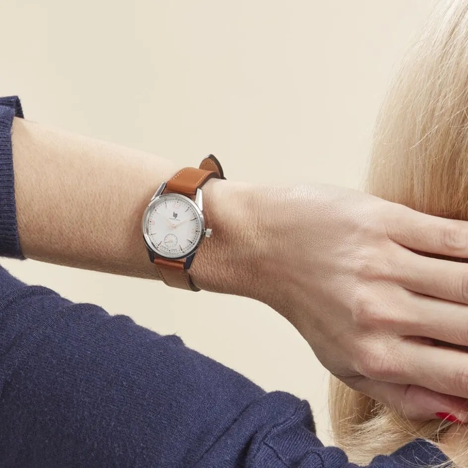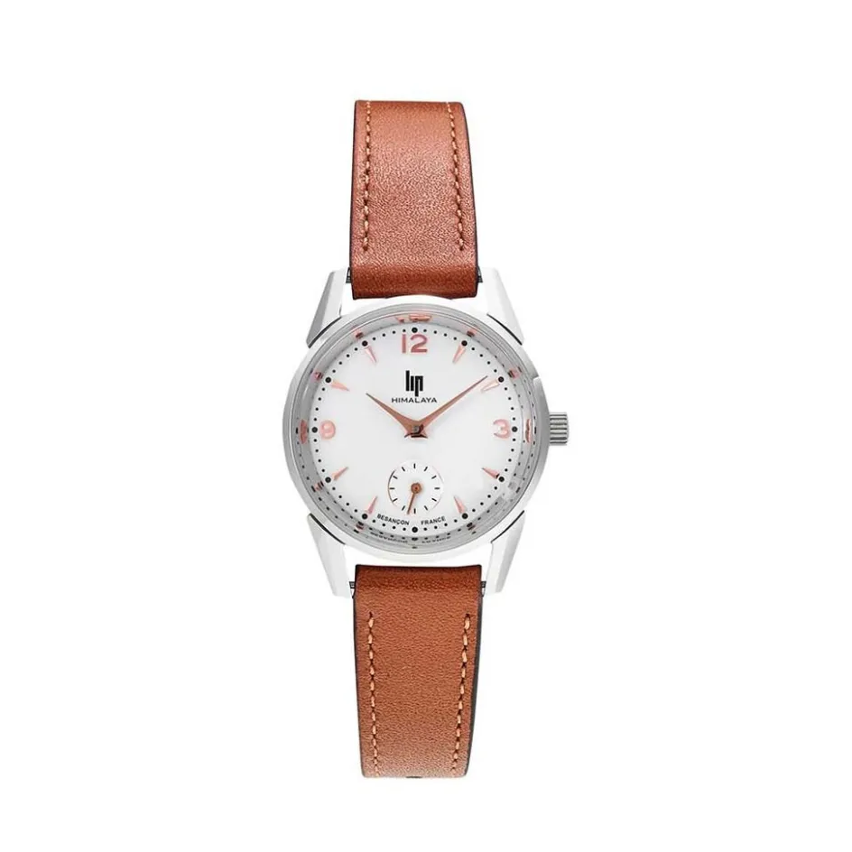 Montre Lip Himalaya C艙ur Battant Acier Argenté Rond Quartz 29mm Fond Argenté Bracelet Cuir Marron 671602
