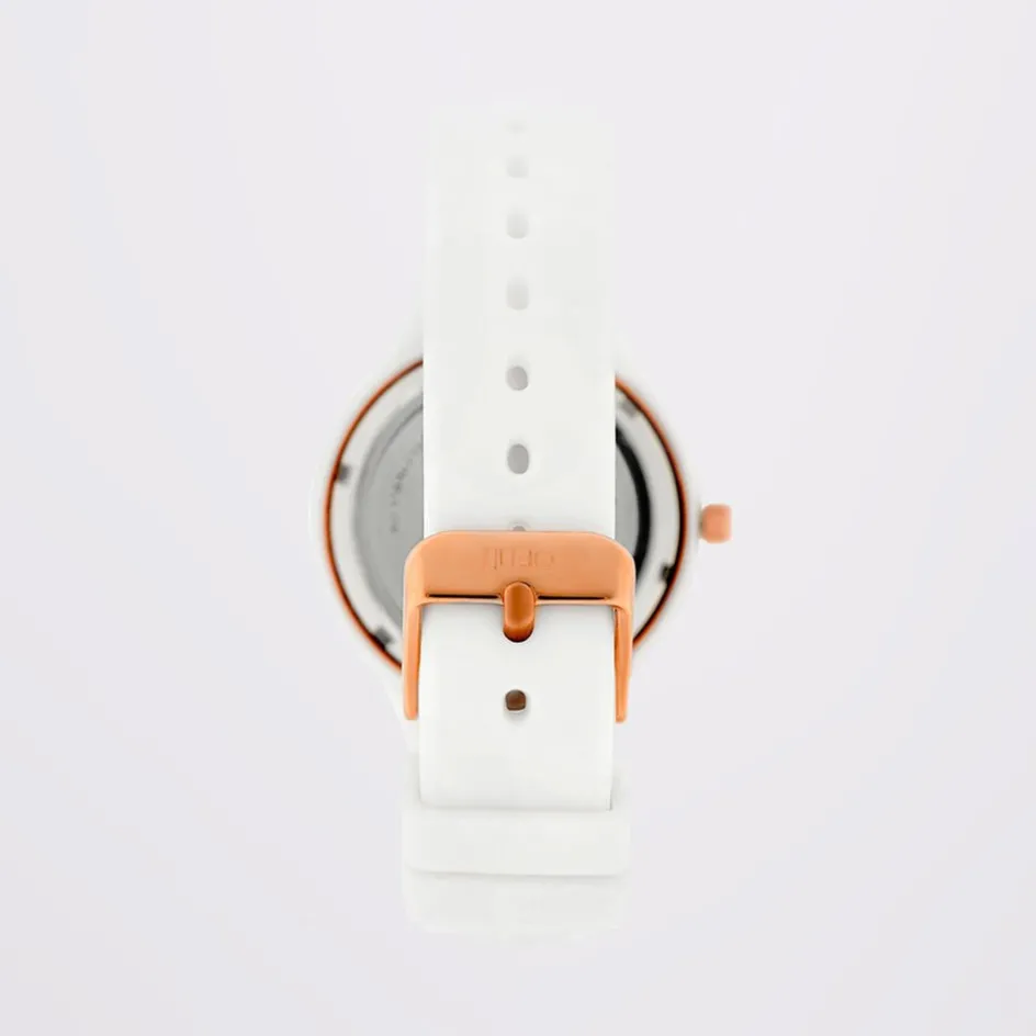 Montre Liu Jo Dancing Sport Acier Noir Ronde Quartz 36mm Entourage Strass Fond Blanc Bracelet Silicone Blanc