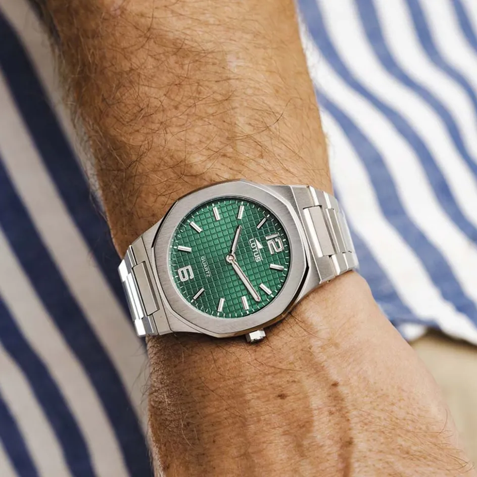 Montre Lotus Excellent Acier Argenté Ronde Quartz 40.5mm Fond Vert Bracelet Acier Argenté 18841/3