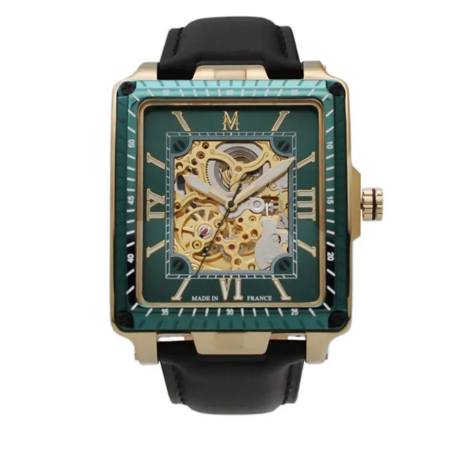 Montre Montignac Square Automatique Acier Doré Carrée Automatique 55*42mm Fond Vert Bracelet Cuir Noir Mow604