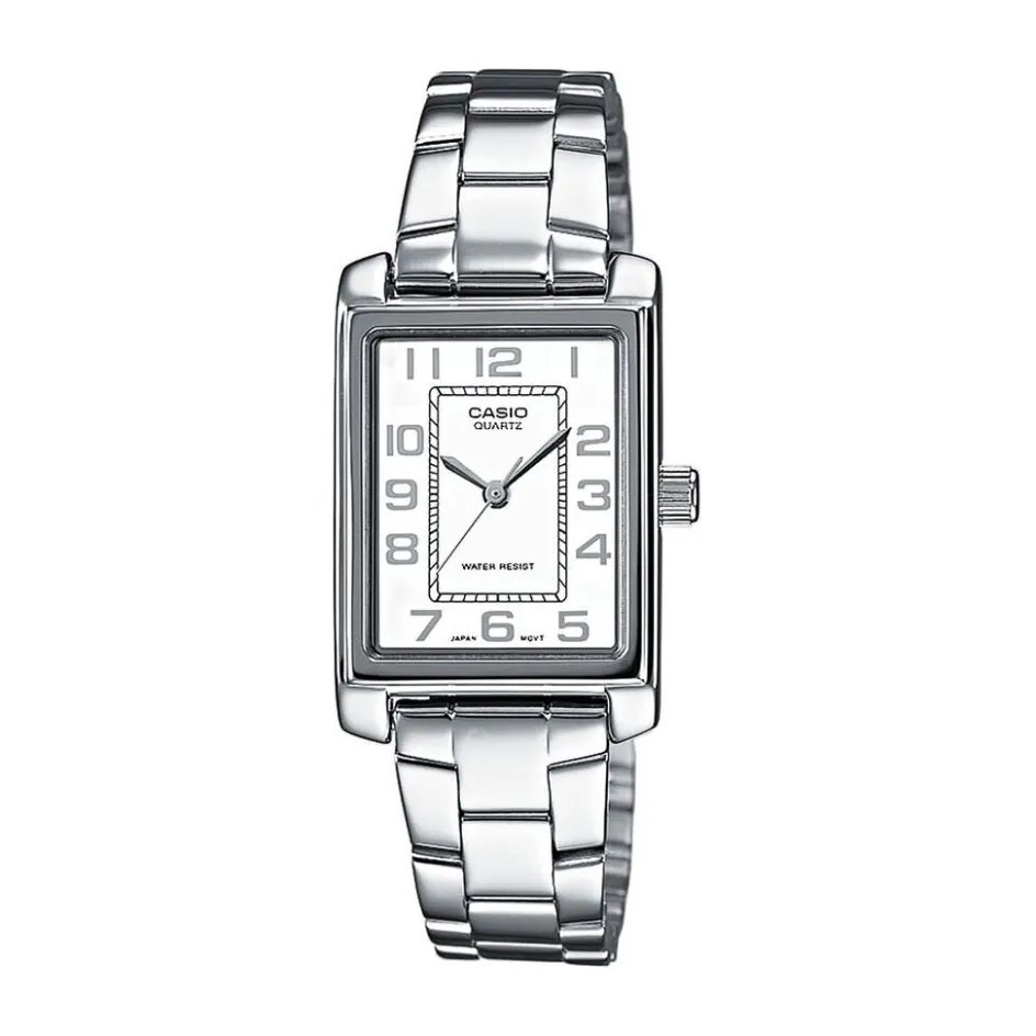 Montre Casio Collection Analogique Laiton Argente Rectangulaire Quartz 21mm Lunette Laiton Argente Fond Blanc Bracelet Acier Argente Ltp-1234pd-7beg