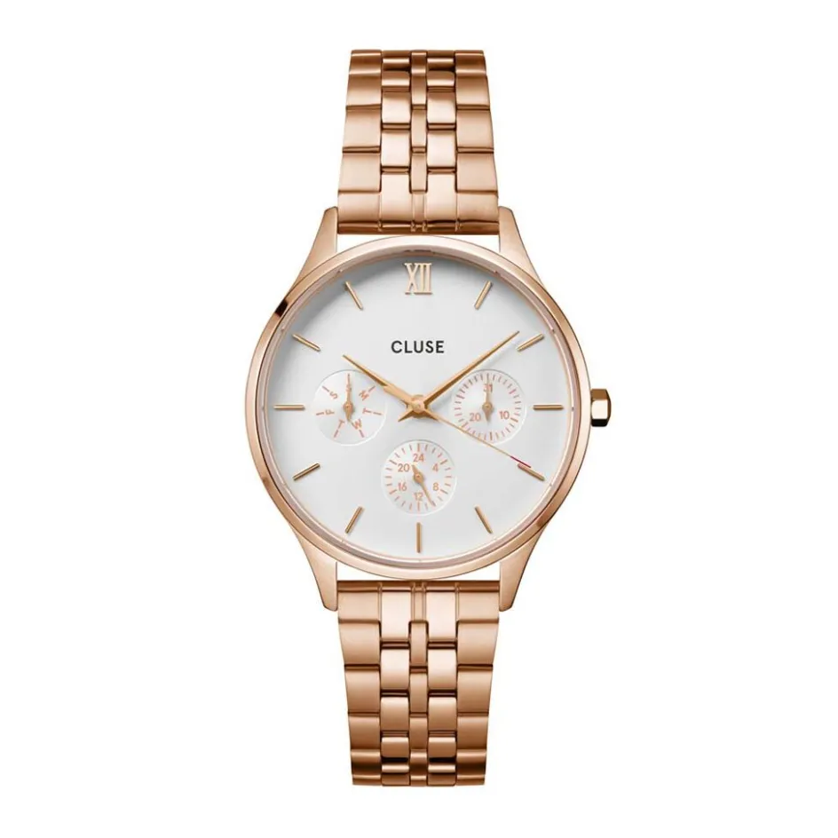 Montre Cluse Minuit Multifonction Acier Rose Rond Quartz Multifonction 34mm Lunette Acier Rose Fond Blanc Bracelet Acier Rose Cw10702