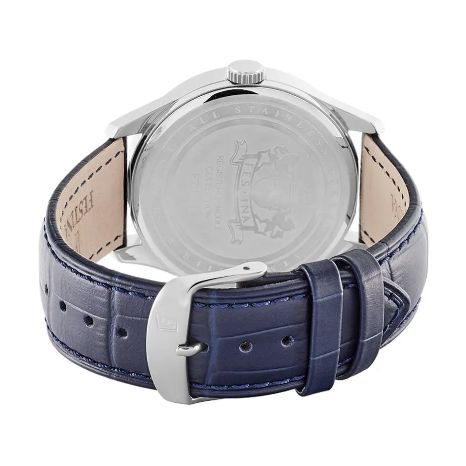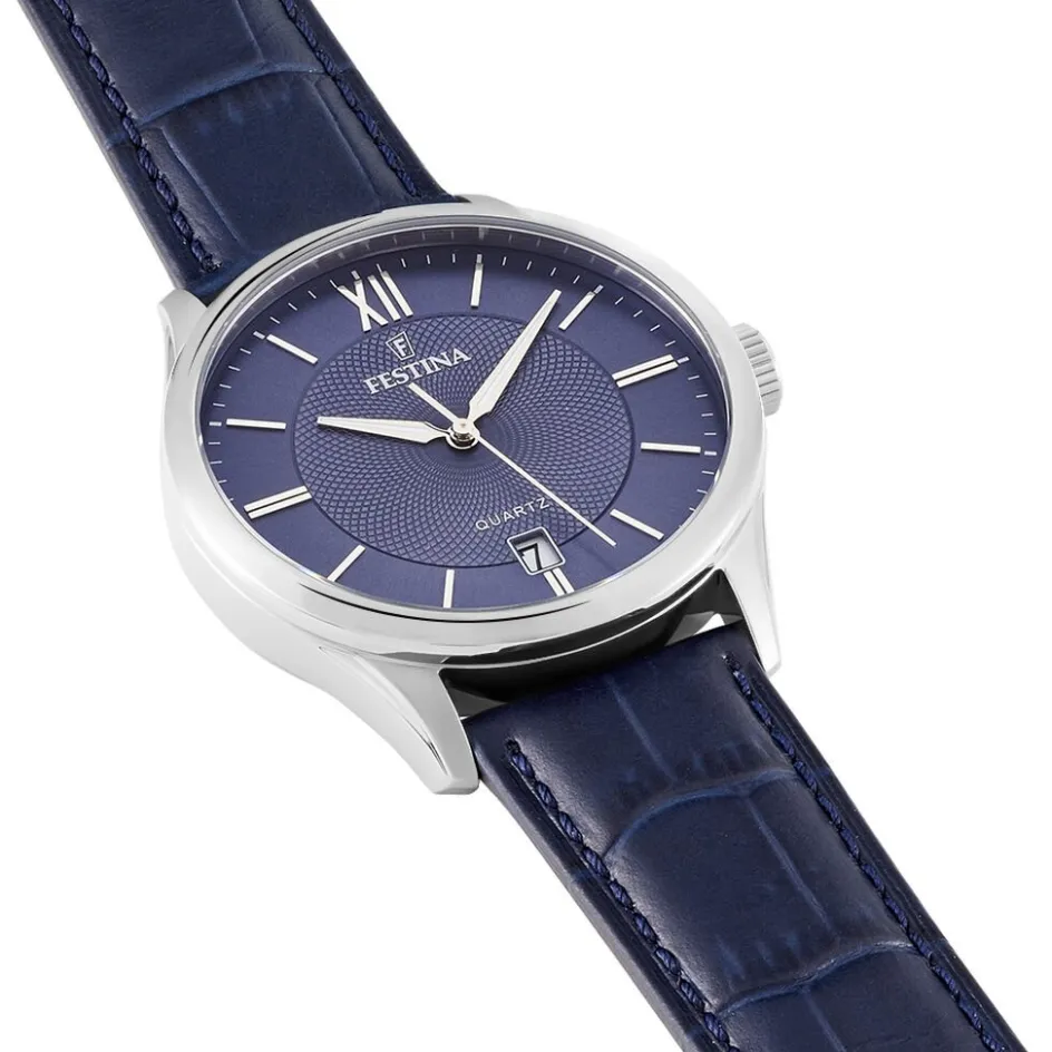 Montre Festina Classics Acier Blanc Ronde Quartz 43mm Fond Bleu Bracelet Cuir Bleu F204262