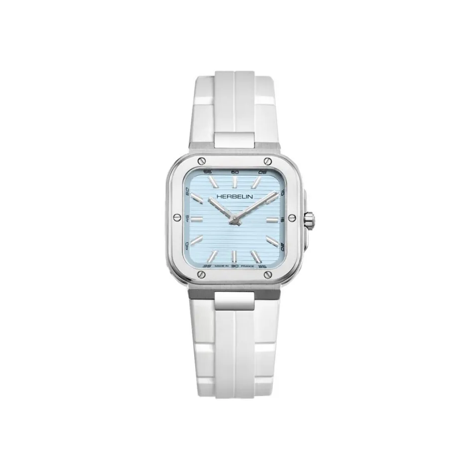 Montre Herbelin Cap Camarat Acier Inoxydable Argenté Quartz Carre 30Mm Fond Bleu Sky Bracelet Silicone Blanc 17546A25Cw