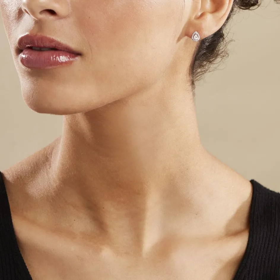 Boucles D’oreilles Or Blanc 375/1000 Puces Oxydes De Zirconium Centraux Formes Poires Entourage Oxydes De Zirconium