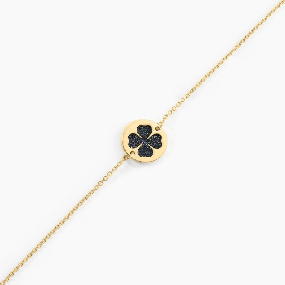 Bracelet Or Jaune 375/1000 Pastille Glitter Noir + Pastille Ajouree Motif Trefle Maille Jaseron 16+2cm
