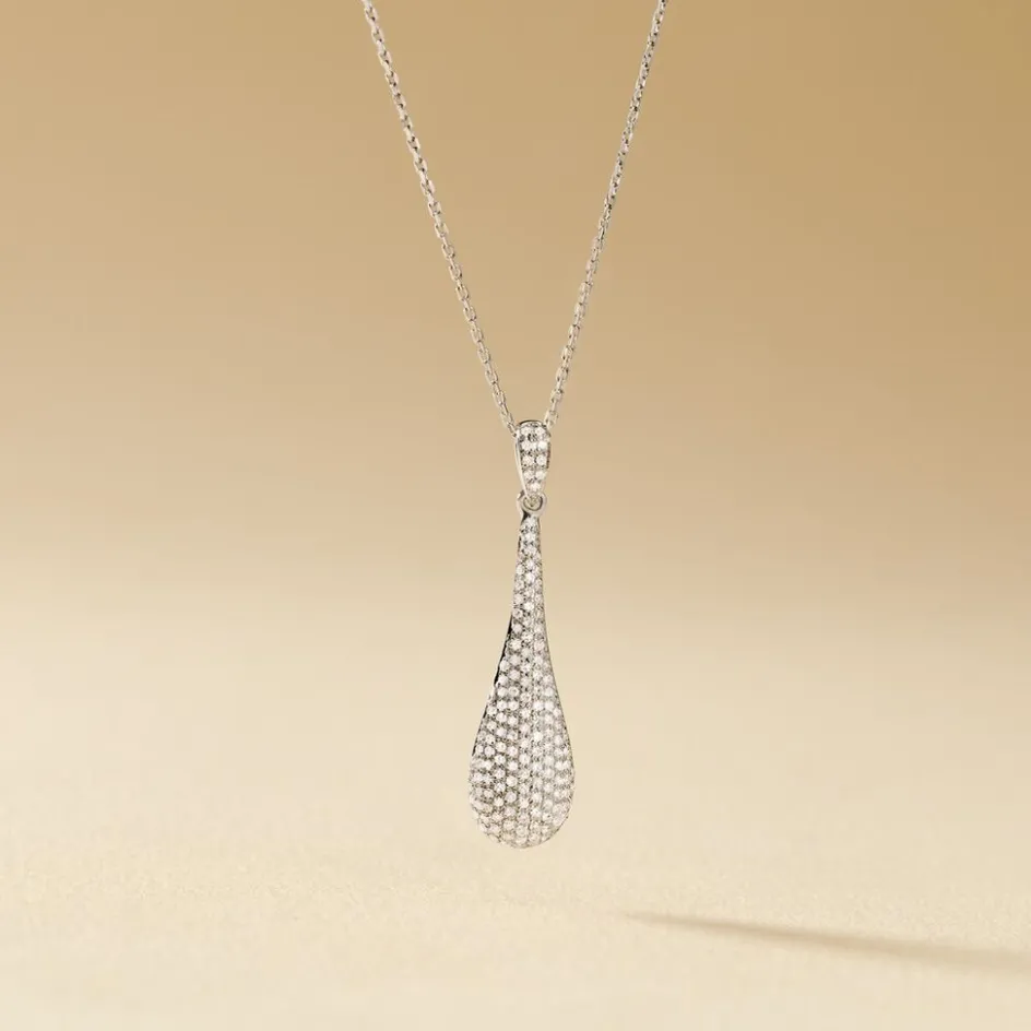 Collier Or Blanc 375/1000 Forme Goutte Pavage Diamants 42cm