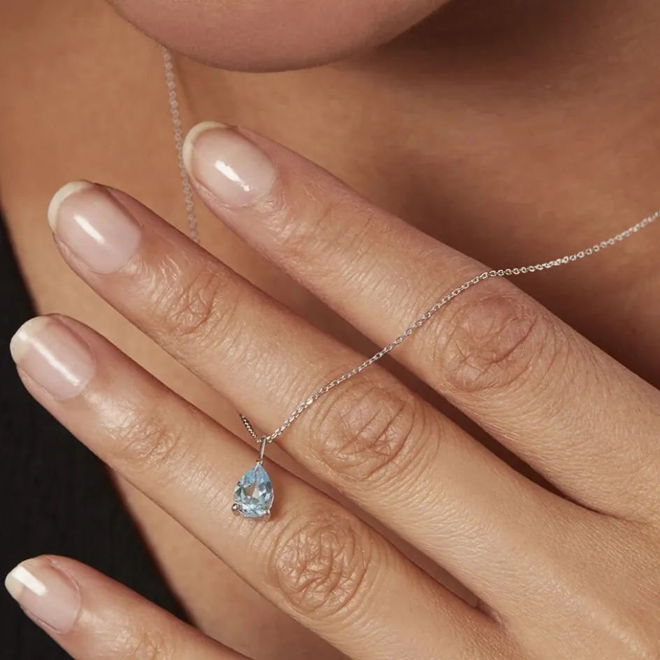 Collier Or Blanc 375/1000 Maille Forçat Topaze Bleue Poire Serti Griffes 45cm