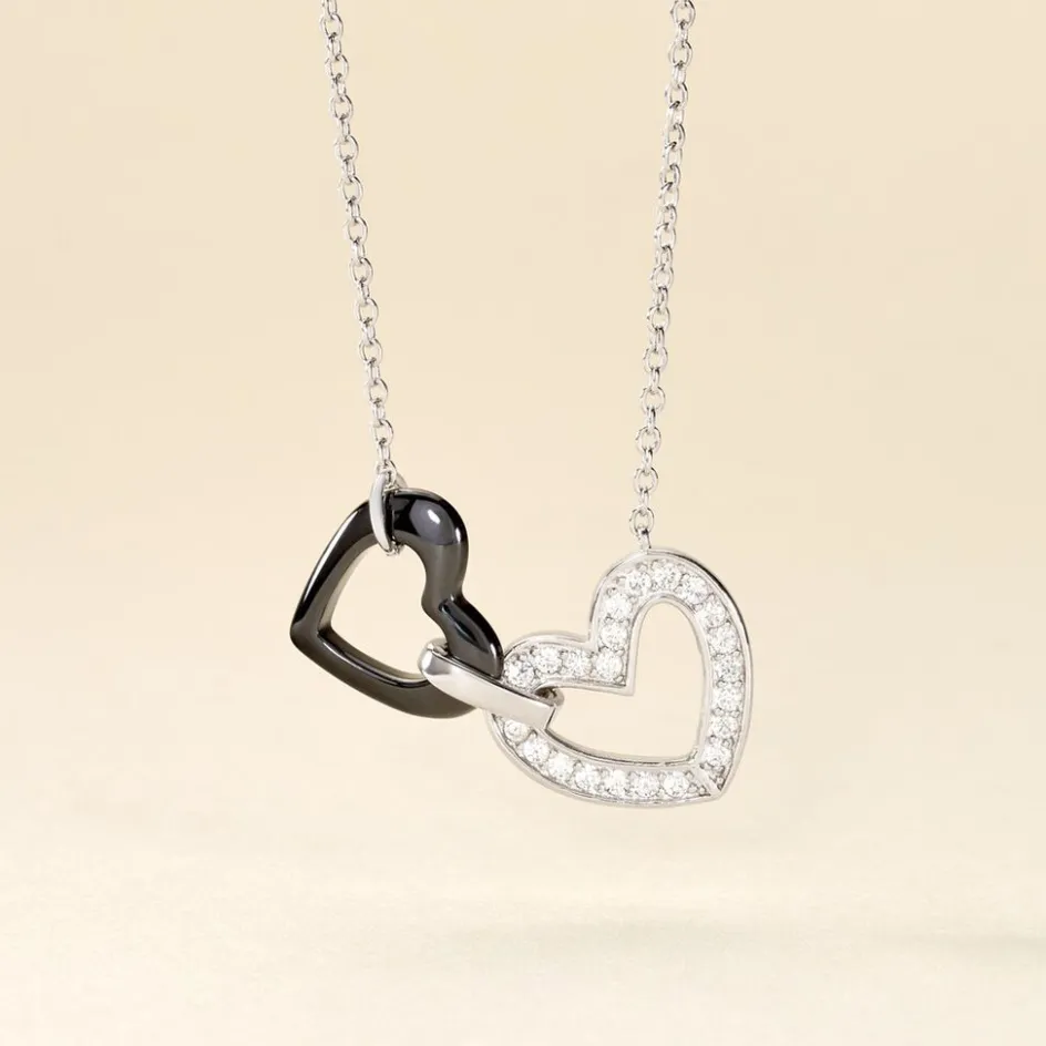 Collier Argent Blanc 925/1000 Double Coeur Céramique Noire Et Oxydes De Zirconium Maille Forçat 42+3cm