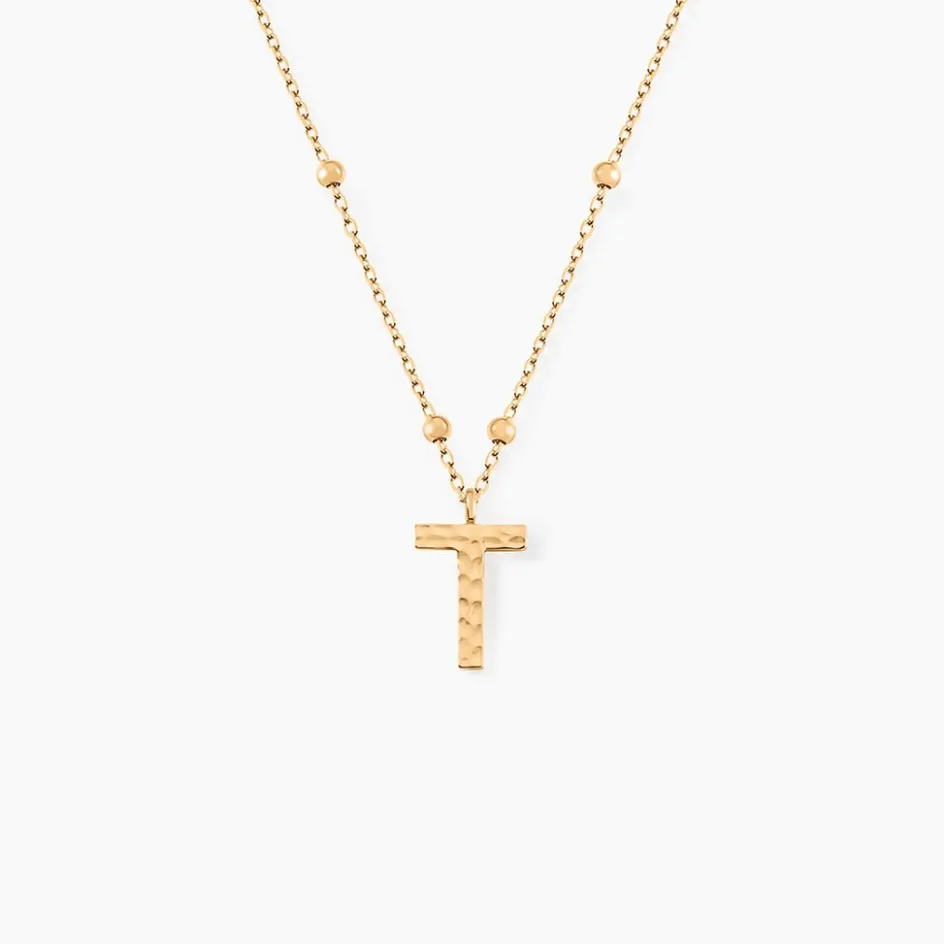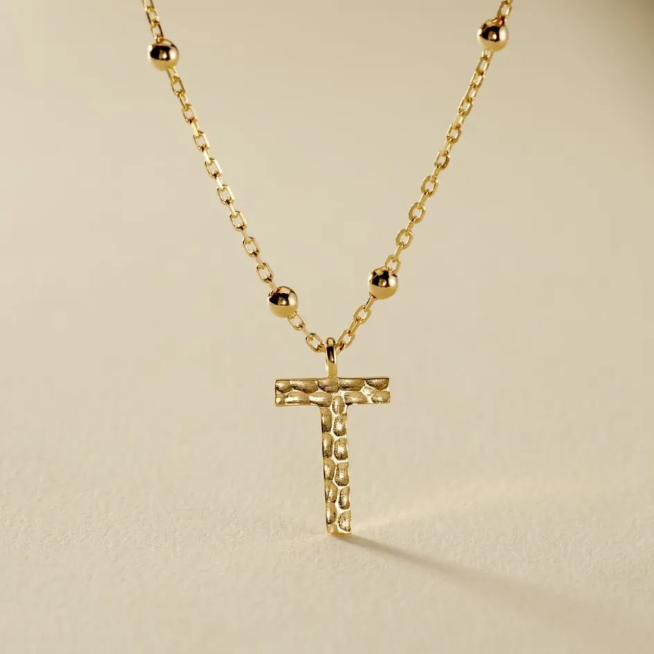 Collier Plaque Or Jaune Lettre T Martelee Et Petites Boules Chaine Maille Forcat Longueur 45cm
