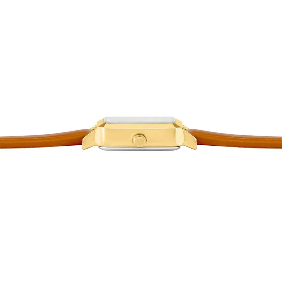 Montre Owatch Square Alliage Dore Carree Quartz 24mm Fond Blanc Bracelet Synthetique Marron