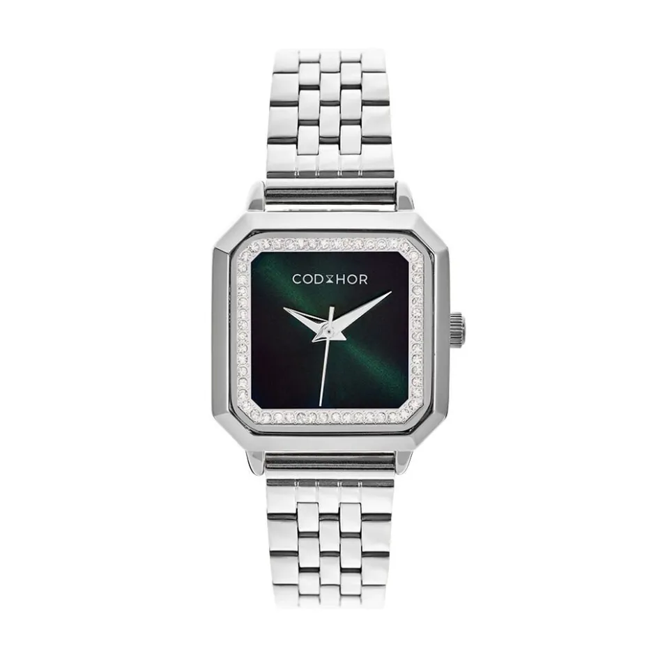 Montre Codhor Carla Alliage Argente Carre Quartz 26mm Fond Vert Strass Blanc Bracelet Acier Argente Ch.4999la/01m